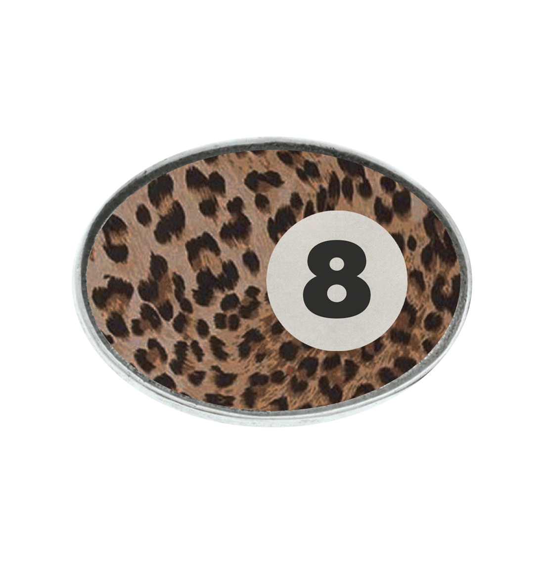 Bold and playful. A dark brown star on leopard print, framed in a wonky silver buckle.