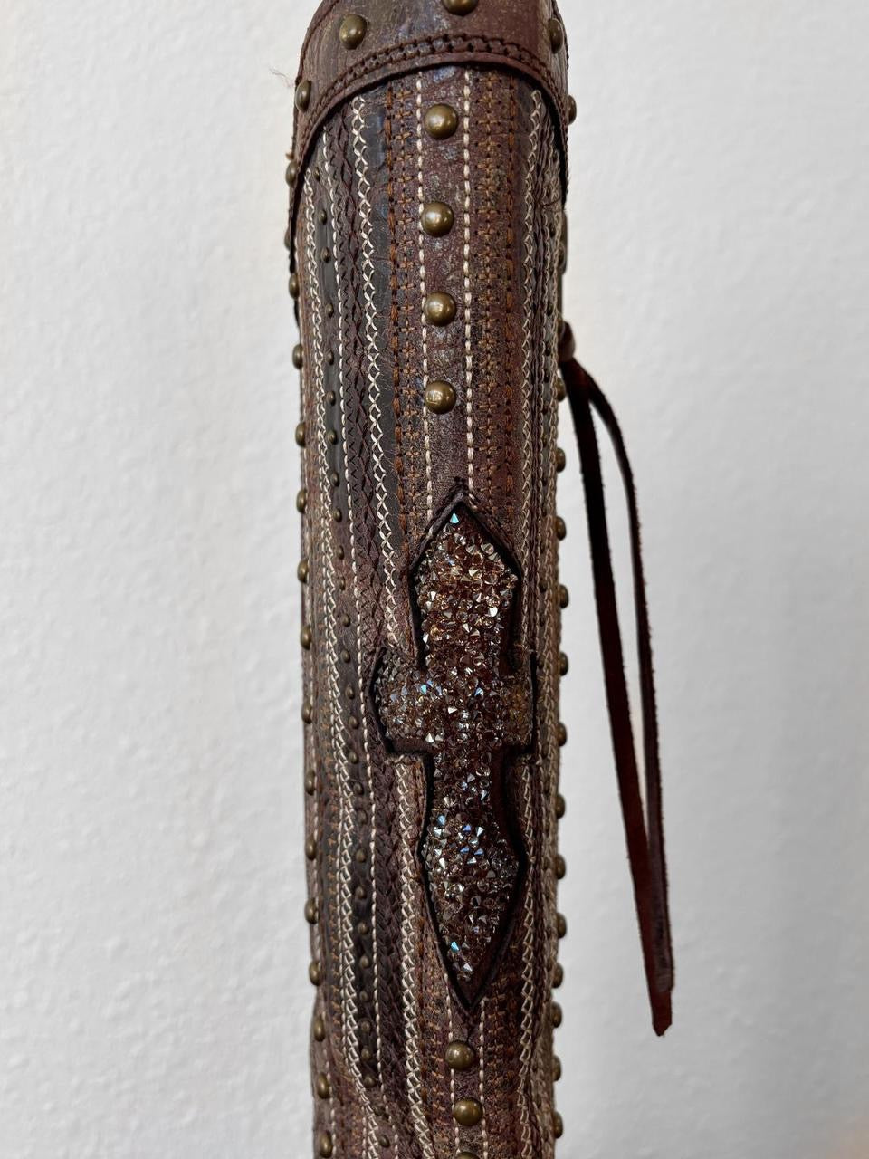 Distressed Corral Boots Women's Studded Tall Snip Toe Western Boots in brown leather with a glitter cross inlay.