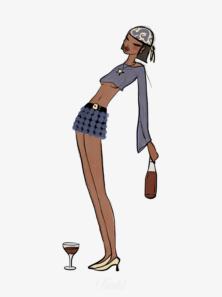 The print 'Jennifer' is an illustration of a cool girl holding a bottle of red wine.