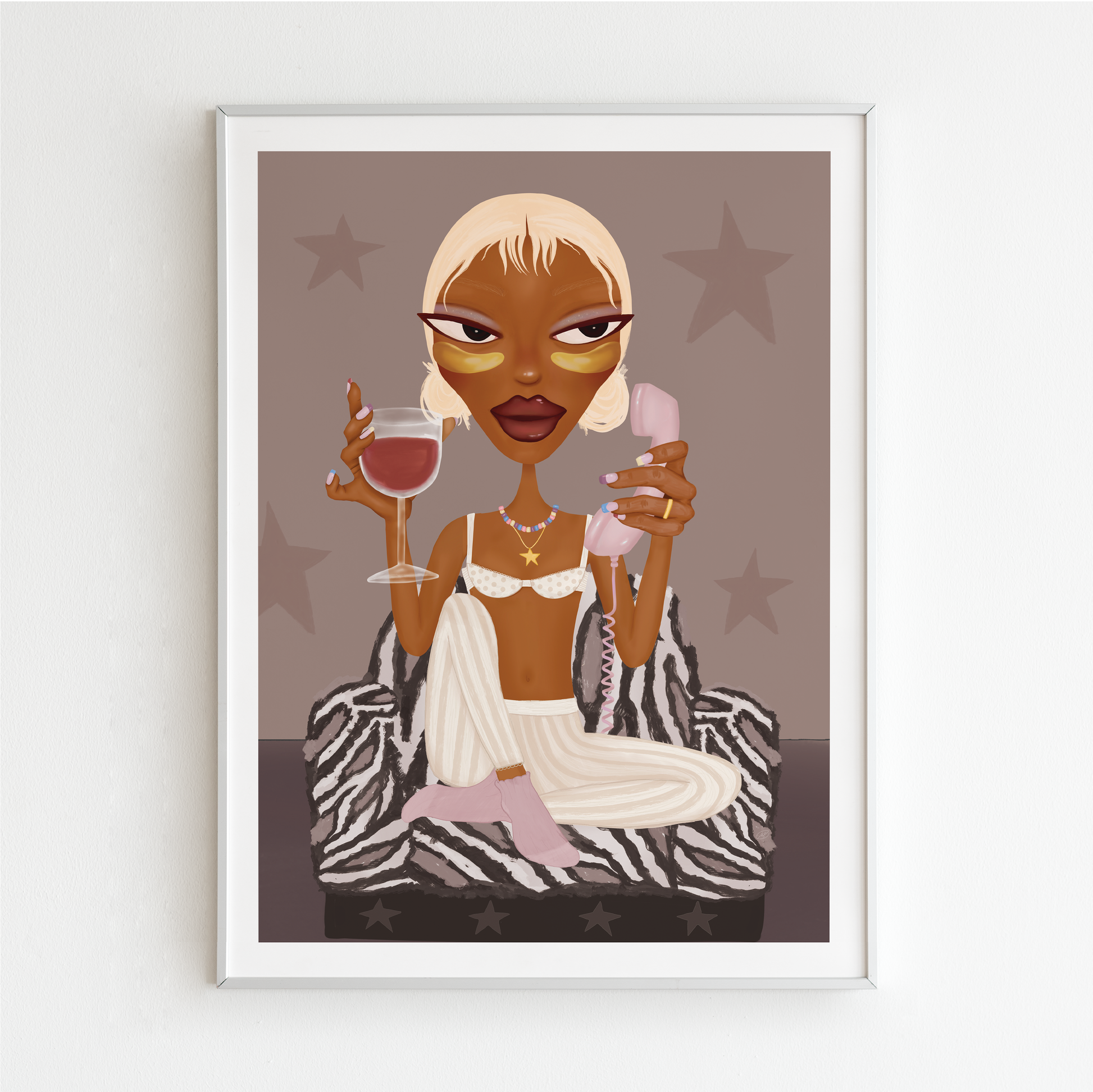 The print 'Speed Dial' portrays a Funki girl sipping wine while chatting with her bestie on the phone.