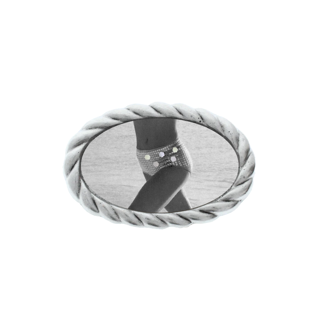 Retro and cheeky, features a gal running in sparkly underwear in a rope-framed oval buckle.