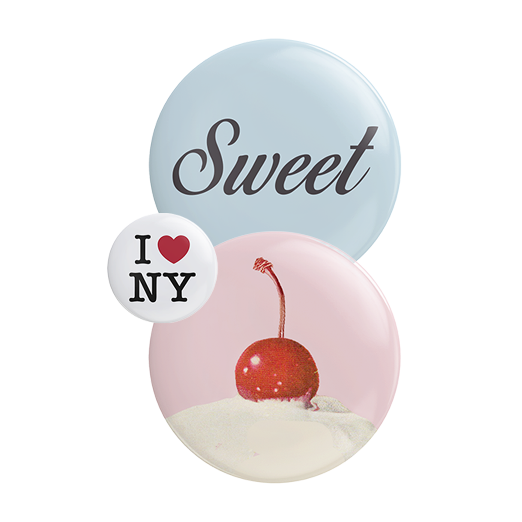 "Sweet NY' Pin Pack includes 3 of Sweet New York Collection pins (2 large & 1 small size). Buttons are high quality with metal backing.